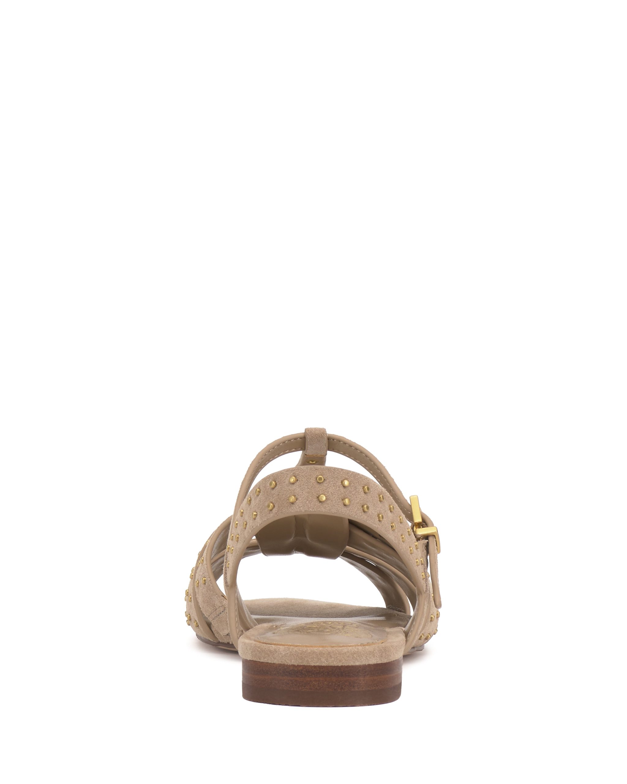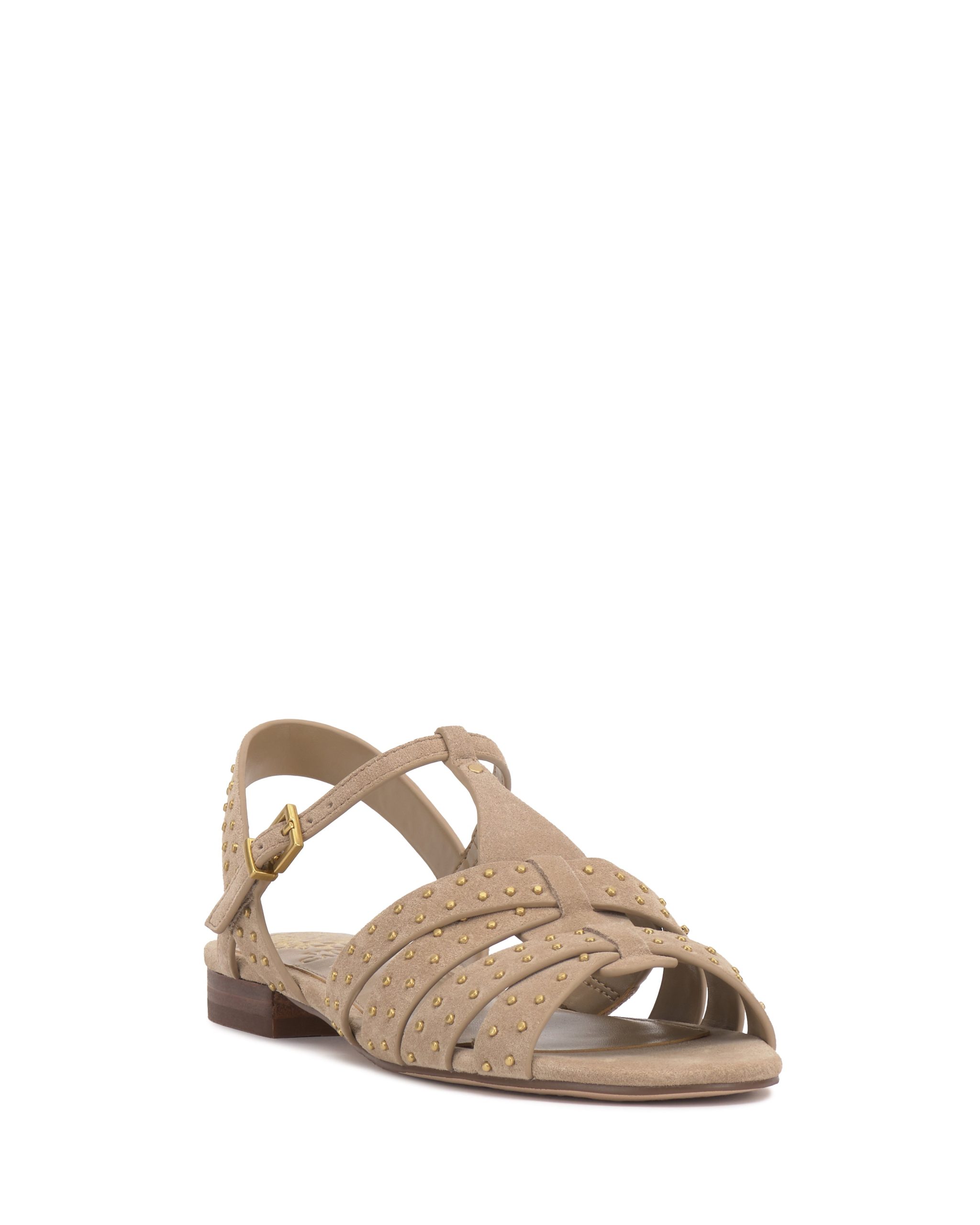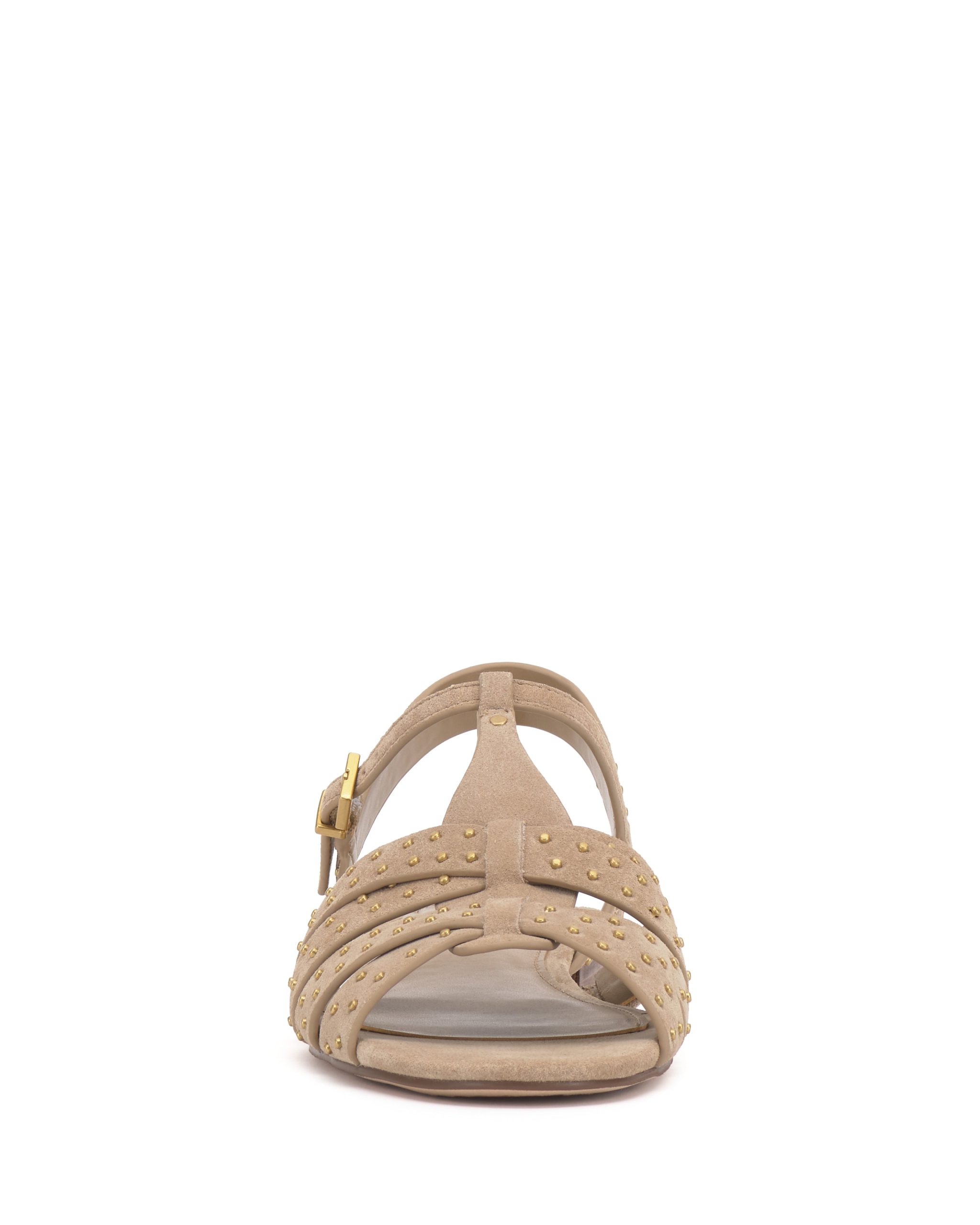 The Chaya sandal updates warm weather looks with modern edge. The strappy silhouette is embellished with sleek microstuds and features an adjustable buckle on the t-strap for the perfect fit.
