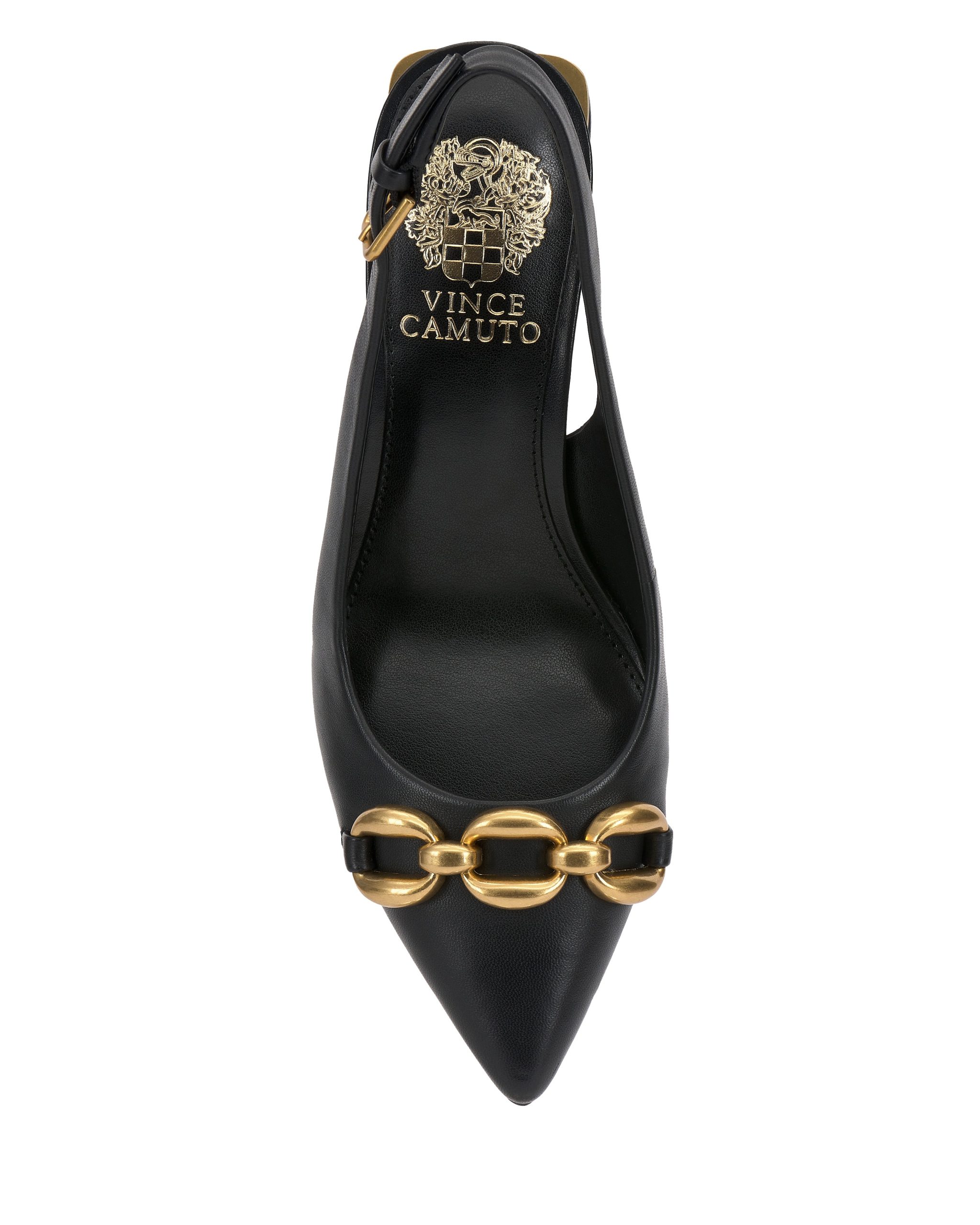 Add a sophisticated upgrade to trousers. pencil skirts. or fitted dresses with the Hamden pump. This sleek slingback features an oversized chain accent at the tapered pointed toe and a covered block heel with a metallic detail for a chic touch of shine.