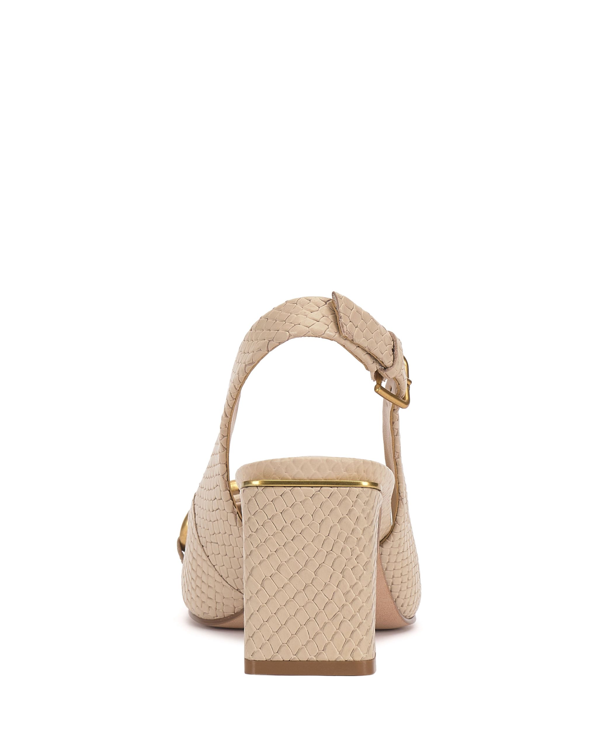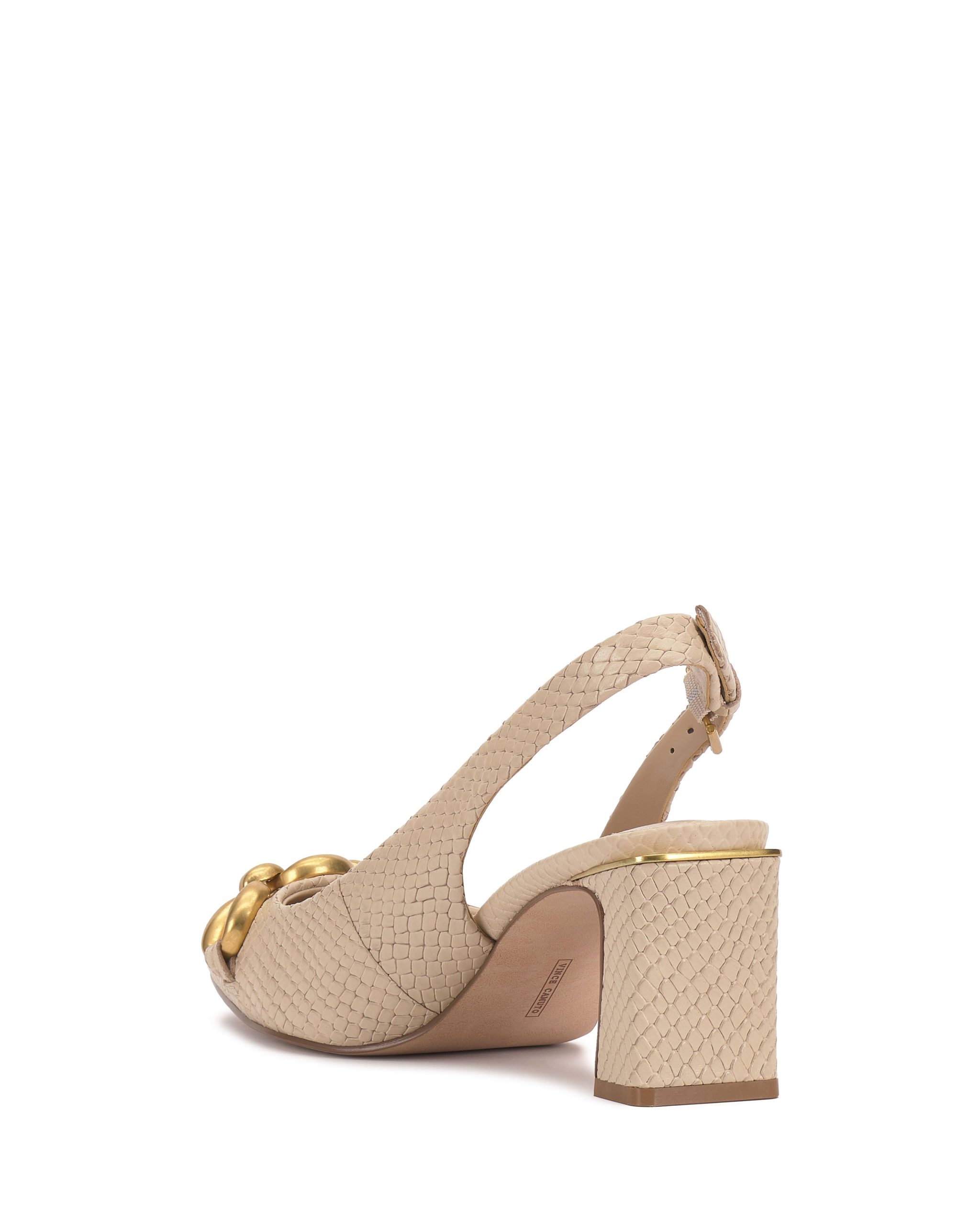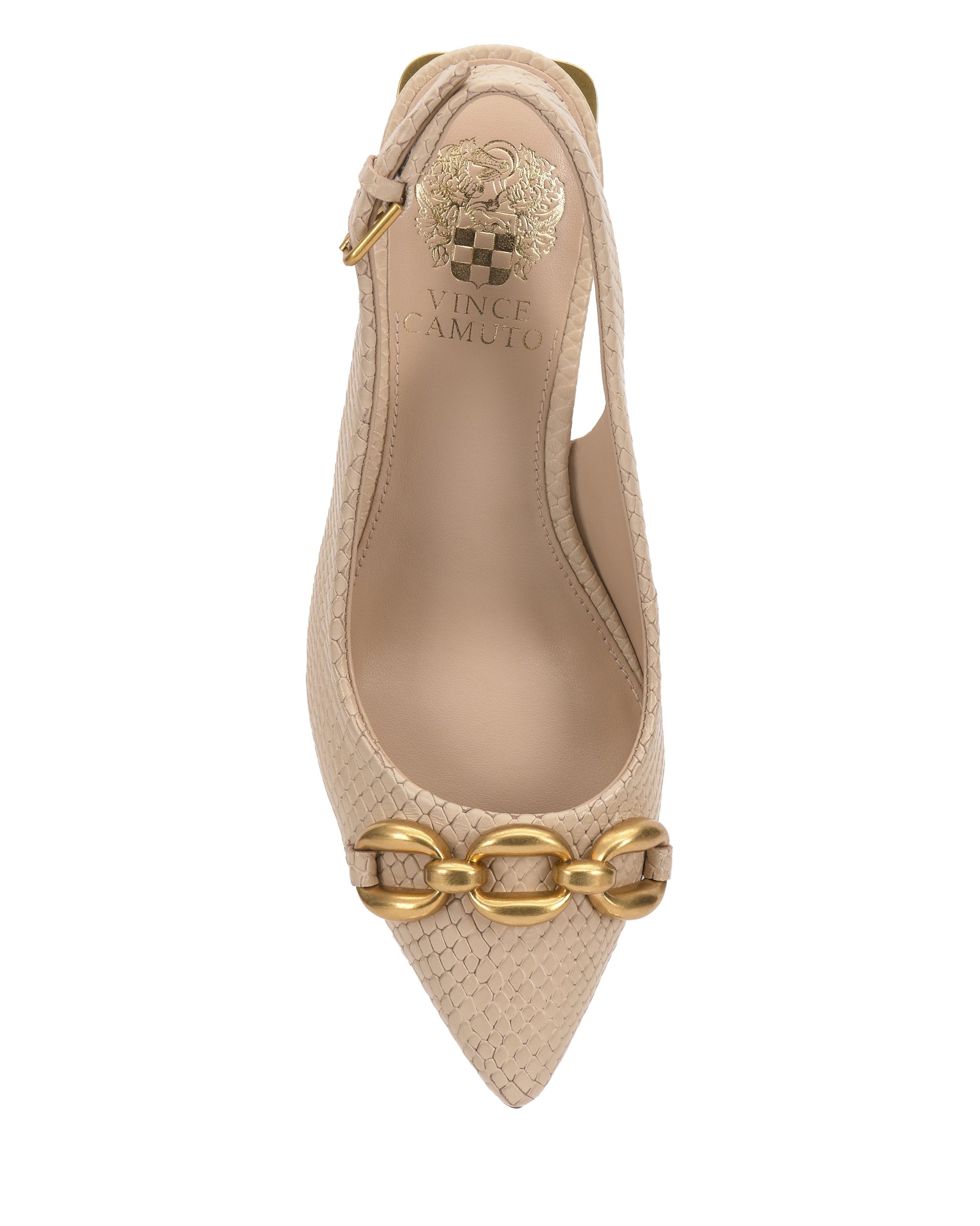 Add a sophisticated upgrade to trousers. pencil skirts. or fitted dresses with the Hamden pump. This sleek slingback features an oversized chain accent at the tapered pointed toe and a covered block heel with a metallic detail for a chic touch of shine.