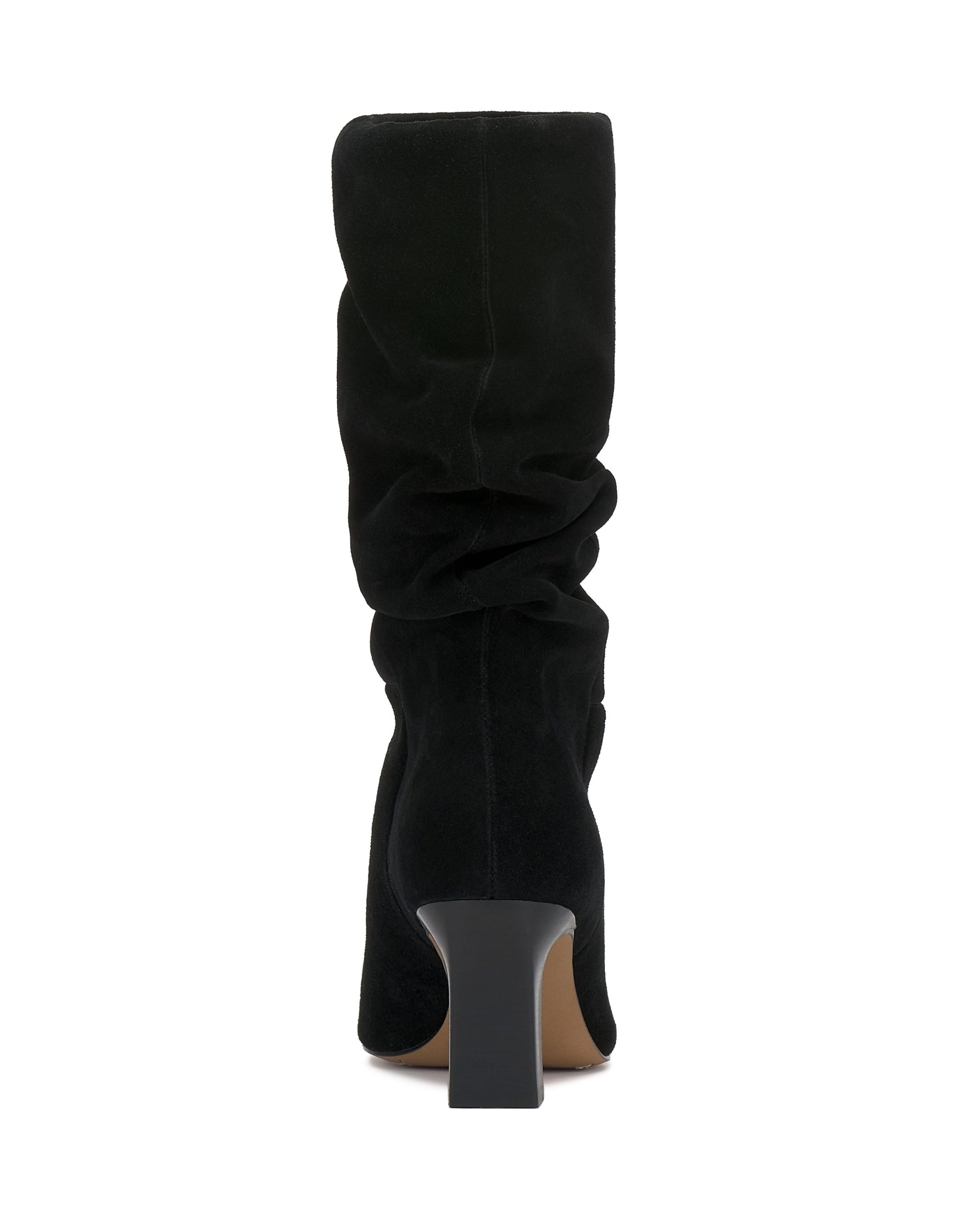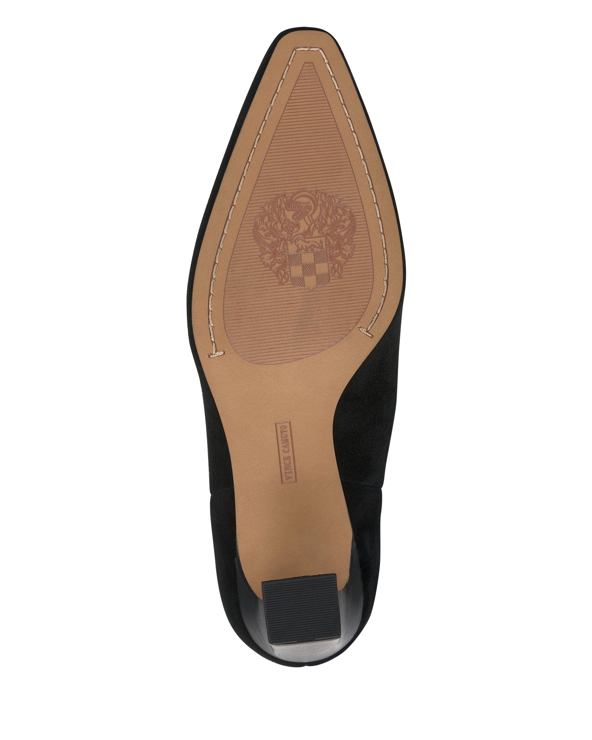 The slouchy suede design and sleek pointed toe makes the Skylar bootie an obvious choice for your cool weather wardrobe. Lifted by a slanted kitten heel. this ankle bootie is perfect to pair with long skirts or hemmed trousers.